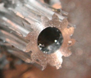 As you can see the teeth aren’t formed correctly. This is actually the 3rd attempt. On my first attempt I accidentally attempted to cut 24 teeth instead of the 13 I was shooting for. I decided the second attempt to cut 12 teeth because it divided cleanly, but forgot to adjust the blank diameter. The third attempt, it looks like I forgot to center the cutter, so it is off… Too late to start a new blank, so left for another night.